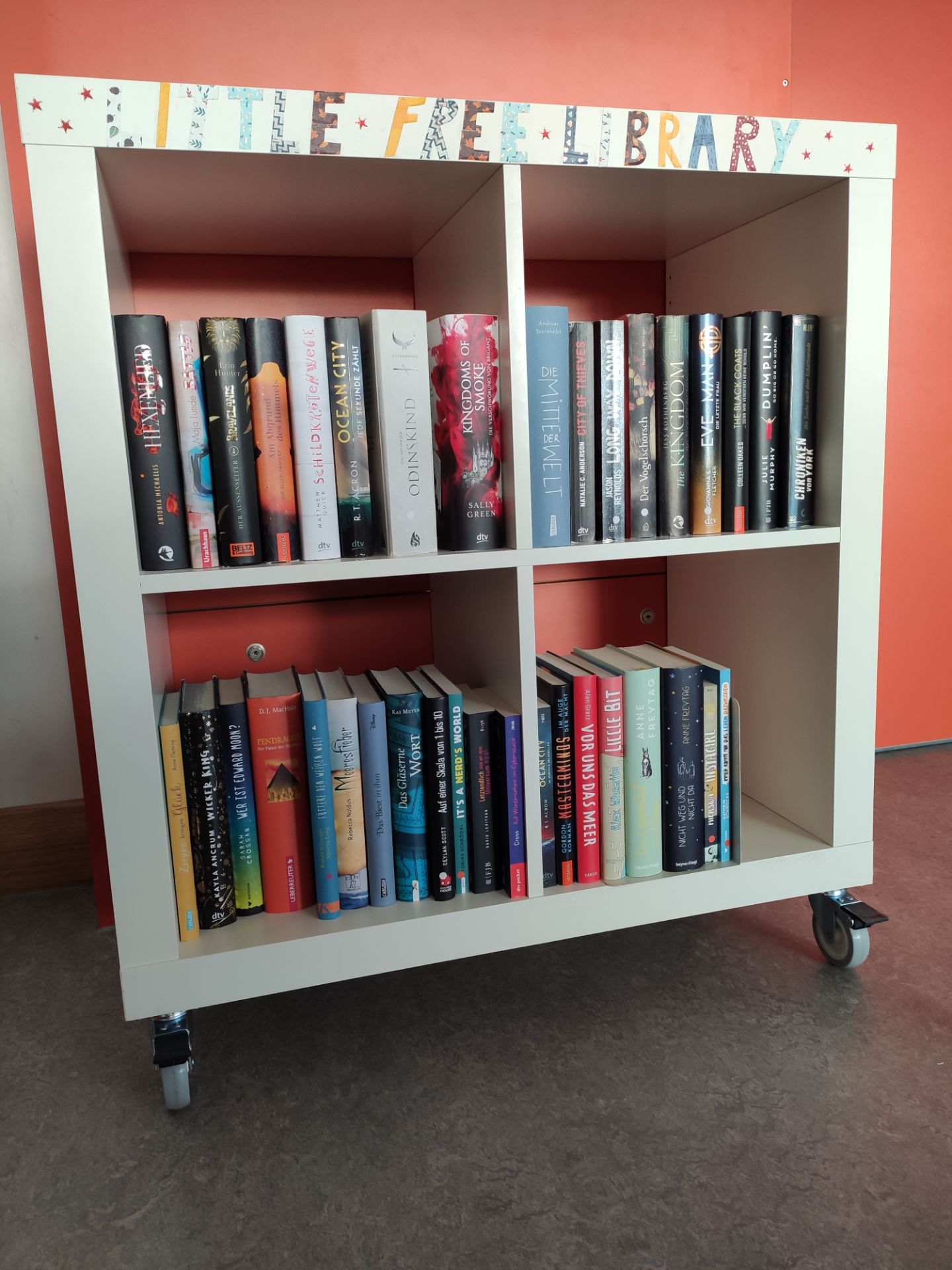 In den Klassen 9 & 10 gibt es ganz nach dem Vorbild der öffentlichen Tauschbüchereien eine little free library. Unser Tauschregal steht auf Rollen und wird wochenweise, bestückt mit Jugendliteratur, je einer neunten oder zehnten Klasse zur Verfügung gestellt und dann zur nächsten Klasse weitergefahren.